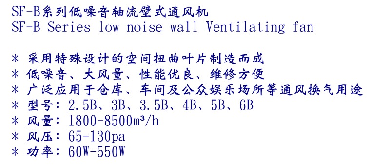SF-B系列低噪音壁式軸流通風機,采用特殊設計的空間扭曲葉片制造而成,低噪音、大風量、性能優良、維修方便,廣泛應用于倉庫、車間及公眾娛樂場所等通風換氣用途。